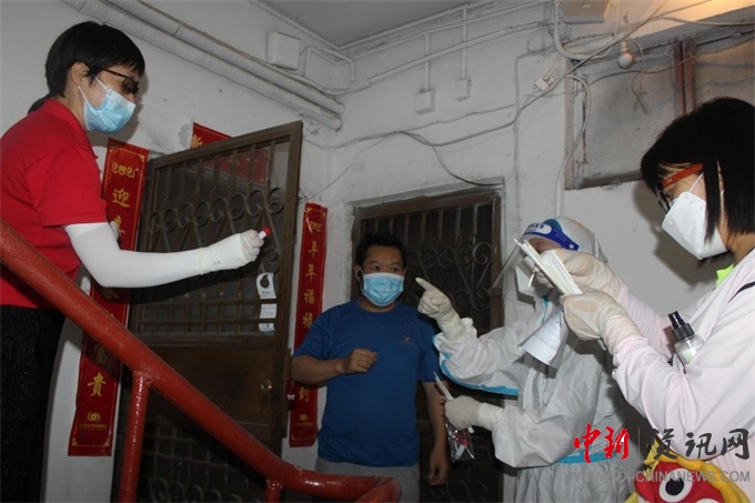 醫(yī)務(wù)人員穿著防護(hù)服,佩戴好手套、口罩、護(hù)目鏡,在社區(qū)工作人員的帶領(lǐng)下到居家隔離人員家中進(jìn)行核酸檢測(cè)采樣工作。核對(duì)身份信息、咽拭子采集、酒精消毒,整個(gè)過(guò)程有條不紊。此外,社區(qū)工作人員堅(jiān)持每日前往居家隔離人員家門前進(jìn)行消毒消殺工作。