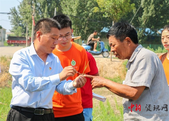 儀式結(jié)束后,在崔慧敏、吳穎賓的帶領(lǐng)下,農(nóng)大師生一行前往土柏崗鄉(xiāng)崗西社區(qū)進(jìn)行科技指導(dǎo)。到達(dá)田間后,師生同種植戶(hù)進(jìn)行親切的交談,“這片玉米為什么長(zhǎng)不高?地里的草怎么有效解決?”眾多群眾帶著困擾已久的問(wèn)題前來(lái)尋求幫助,王永華、彭延教授仔細(xì)聆聽(tīng),耐心一一解答。由于咨詢(xún)?nèi)罕娸^多,在社區(qū)委員會(huì)開(kāi)展農(nóng)業(yè)技術(shù)培訓(xùn)講座,現(xiàn)場(chǎng)發(fā)放宣傳冊(cè)及捐贈(zèng)農(nóng)藥。