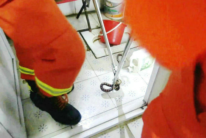 到達(dá)現(xiàn)場(chǎng)后,救援人員發(fā)現(xiàn):一條長(zhǎng)約一米的赤鏈蛇,正盤踞在衛(wèi)生間的墻角。由于事發(fā)突然,該戶居民家里還有孩子,把主人急壞了。