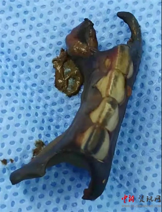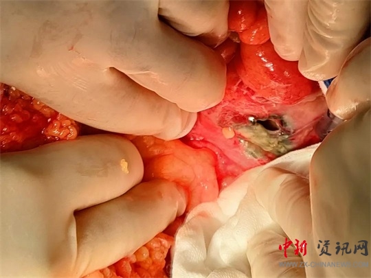 當(dāng)晚9點(diǎn)40分,廖新偉積極協(xié)調(diào),麻醉科手術(shù)部及輸血科密切配合,以劉大勇主刀、副主任醫(yī)師汪麗偉輔助,緊急為侯老太太施行了手術(shù)。打開(kāi)腹腔,驚人地發(fā)現(xiàn)侯老太太腹腔已被糞便填滿,腸子漲的像氣球那么大。術(shù)中,經(jīng)過(guò)沖洗并且減壓腸道后,醫(yī)護(hù)團(tuán)隊(duì)在直腸上段發(fā)現(xiàn)一大小約1.5cm破口,一堅(jiān)硬物嵌頓在破口處,打開(kāi)腸壁,一排帶鉤的假牙映入眼前。醫(yī)護(hù)人員將假牙小心翼翼地完整取出,足足有4cm長(zhǎng)。由于侯老太太腹腔污染嚴(yán)重,且腸梗阻時(shí)間較長(zhǎng),腸壁水腫十分嚴(yán)重,無(wú)法再次重建消化道,于是胃腸外科團(tuán)隊(duì)給老太太做了直腸遠(yuǎn)端封閉+乙狀結(jié)腸造口術(shù)。考慮到患者腹腔污染術(shù)后可能出現(xiàn)感染腹腔膿腫等情況,醫(yī)護(hù)團(tuán)隊(duì)給侯老太太左右上下總共放了5根引流管。