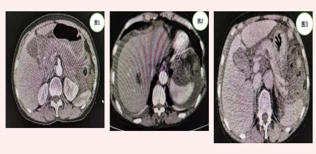 患者張某入院時,急診行全腹CT(見圖1)等相關檢查發(fā)現(xiàn)上腹部包塊但未見明顯肝脾破裂及腹腔積液。由于患者外傷,病情隨時可能加重,主管醫(yī)師張浩杰嚴密觀察病情時,患者腹痛加重,血紅蛋白進行性下降,立即復查上腹部增強CT(見圖2、3)發(fā)現(xiàn)腹腔大量積液。