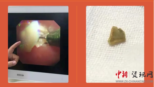 9月18日上午,施璐、副主任醫(yī)師張雷、主治醫(yī)師高清麗在內(nèi)鏡中心的密切配合下順利為思賢實(shí)施支氣管鏡手術(shù)。進(jìn)鏡后,在思賢右側(cè)中間支氣管處可見一黃白色塊狀異物,周圍有少量肉芽組織增生。醫(yī)護(hù)團(tuán)隊(duì)緩慢套取、收緊,確定牢牢鎖定異物后,將異物完整取出,映入大家眼簾的是一塊不完整的南瓜子……由于配合默契、操作熟練,醫(yī)護(hù)團(tuán)隊(duì)僅用時(shí)5分鐘便順利完成手術(shù)。術(shù)后,思賢父母看到取出的異物滿眼含淚,感激之情溢于言表。