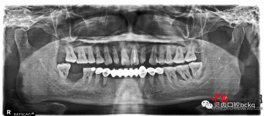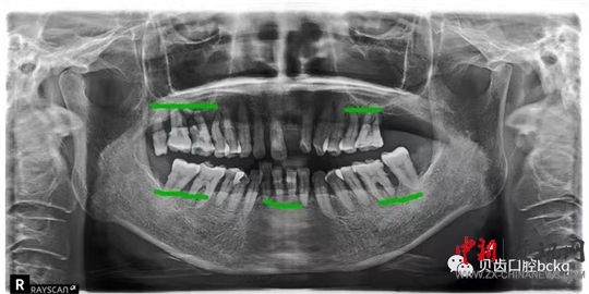 下面這兩張x光片是比較典型的牙周炎的影像資料。該患者的全口所有牙齒都出現了不同程度的松動;颊攥F在感覺無法用牙齒咀嚼。坦白地講,牙周炎發(fā)展到這種程度,很多時候醫(yī)生也束手無策了。為了保留更多的牙槽骨,醫(yī)生回不得不拔掉哪些嚴重松動的患牙。