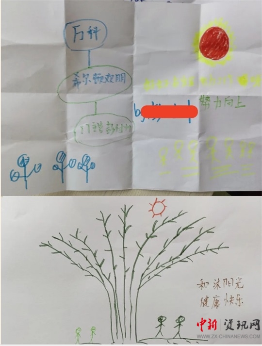 小威說(shuō):“我希望我們一家四口永遠(yuǎn)在一起,一起吃飯,一起養(yǎng)一些小豬、小雞維持生計(jì),都不要去外地工作,黑色筆畫(huà)的是我,因?yàn)槲业昧司癫,需要治病花錢(qián),所以父母只能外出打工……”