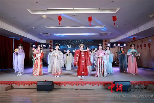 漢服表演《錦繡國風》中,演員身著漢服,以端莊優(yōu)美的步伐和舞姿展現(xiàn)中國傳統(tǒng)服飾的魅力,弘揚中華民族優(yōu)秀傳統(tǒng)文化,F(xiàn)場座無虛席,暖意陣陣,處處洋溢著新春的歡樂祥和。