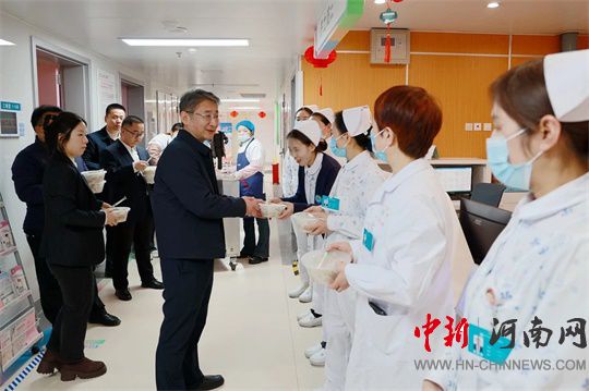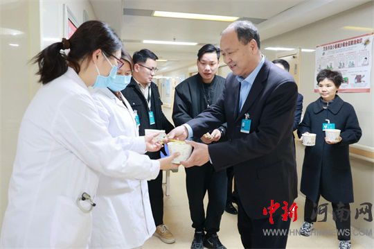 “大家值班辛苦了!”張志韌來到兒內(nèi)一科、兒內(nèi)二科、生理產(chǎn)科、病理產(chǎn)科、急診科等科室,親切看望慰問了這里堅守崗位的醫(yī)務(wù)人員和住院患者,向他們送上熱氣騰騰的餃子。