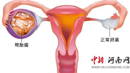畸胎瘤是卵巢生殖細胞腫瘤中最常見的一種,是由于卵巢組織中的原始生殖細胞異常分化而形成的?砂l(fā)生在任何年齡,但多發(fā)生于年輕婦女及幼女。