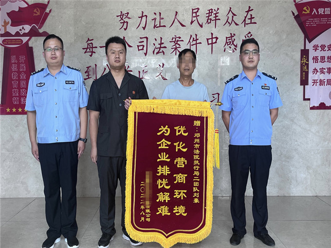 在被執(zhí)行人償還所有款項(xiàng)后,該院依法解除了對其賬戶的凍結(jié)。9月5日上午,被執(zhí)行人對鄧州法院的善意執(zhí)行非常感激,拉著執(zhí)行干警劉豪的手激動萬分,并送來一面“優(yōu)化營商環(huán)境,為企業(yè)排憂解難”錦旗。