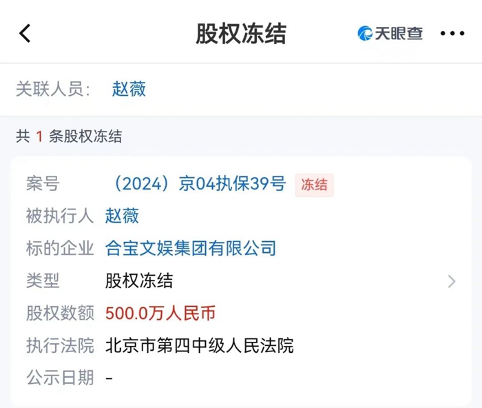 某眼查信息顯示,4月11日,趙薇名下部分所持股權(quán)被凍結(jié),凍結(jié)股權(quán)標(biāo)的企業(yè)為合寶文娛集團(tuán)有限公司,執(zhí)行法院為北京市第四中級人民法院,被凍結(jié)股權(quán)金額為500萬元人民幣,凍結(jié)期限至2027年4月10日。