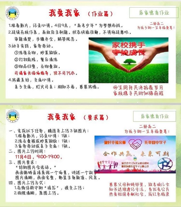 學(xué)生在家,家長是監(jiān)督員。為了加強(qiáng)家長的配合意識,學(xué)生返家的第一個(gè)線上家長會(huì)上,我們就讓各班傳達(dá)家長監(jiān)督配合的重要性,家長是老師的教育合伙人、同道人,安排家長網(wǎng)課期間做好孩子的后勤保障,為學(xué)生創(chuàng)造一個(gè)安靜的學(xué)習(xí)環(huán)境。為了提高家長的教育能力,我們配合家長學(xué)校組織各班家長參與網(wǎng)上學(xué)習(xí),要求家長拍學(xué)習(xí)照片。鼓勵(lì)學(xué)生學(xué)習(xí)之余參與家務(wù)勞動(dòng),幫家長洗衣、作飯、打掃衛(wèi)生,讓家長體會(huì)到咱們的三為教育成果,從而更有信心的參與到學(xué)生管理中來。