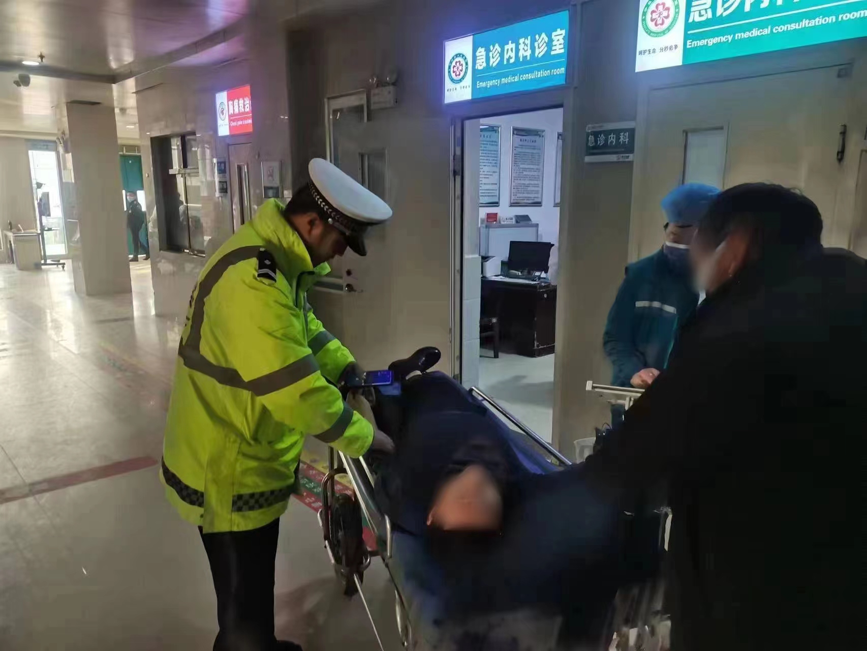 在服務(wù)區(qū)民警很快找到司機(jī)報(bào)警的豫K92***轎車,發(fā)現(xiàn)司機(jī)躺在駕駛座上面色蒼白,氣息不均,痛苦不已。司機(jī)告訴民警,他感覺(jué)頭昏眼花、胸悶胸痛、手腳冰涼抽搐,身體無(wú)法動(dòng)彈。民警現(xiàn)場(chǎng)安慰司機(jī)不要擔(dān)心害怕,120救護(hù)車幾分鐘就會(huì)趕到。病人情況危急,120急救車輛到來(lái)后,民警和醫(yī)護(hù)人員當(dāng)即將病人抬上救護(hù)車迅即駛往最近的寧陵縣人民醫(yī)院。在警車一路護(hù)送下,原本大概需要用時(shí)30分鐘的20公里路程,僅用了不足15分鐘,就將司機(jī)送至醫(yī)院急診室,為患者爭(zhēng)取到寶貴的救治時(shí)間。