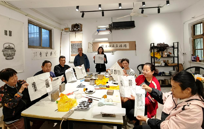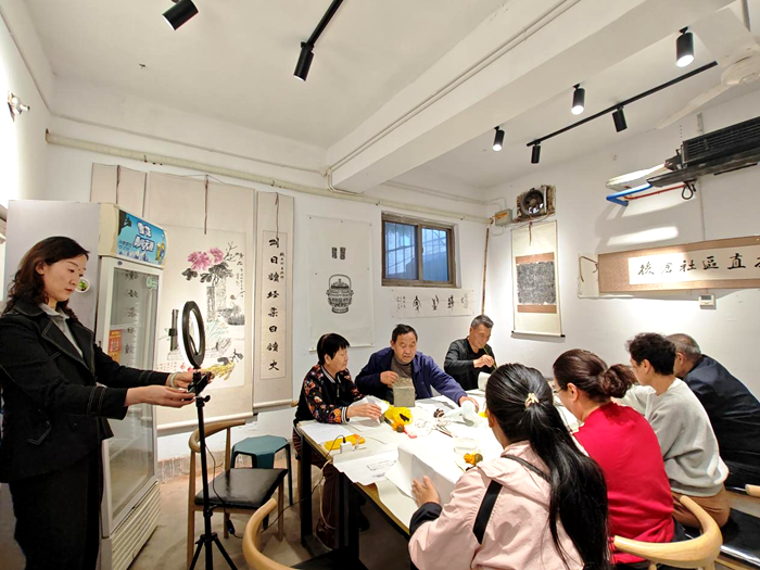 近日,后倉街社區(qū)為了更好的利用直播間優(yōu)化商戶服務,來到倉巷街商戶佳泉文化工作室,和商戶負責人蘇偉老師共同分享后倉街社區(qū)直播間。該商戶是中國傳統技藝拓片傳習所。社區(qū)邀請轄區(qū)居民文化愛好者和我們一起,到直播間免費學習拓片的制作過程。工作室古色古香,墻上掛滿了各種拓片作品,充滿了濃厚的文化氣息。通過后倉街社區(qū)直播間,線上線下同時互動,學習拓片的來歷、制作方法及意義。轄區(qū)居民王有才現場談了自己的學習感受,不僅增長了見識,開闊了眼界,同時弘揚了中國傳統文化技藝,對佳泉文化工作室有了更新更深的了解認識。