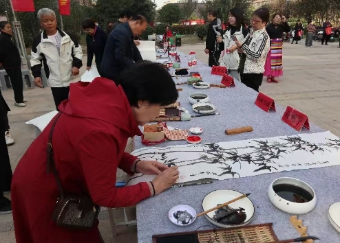 筆會在社區(qū)藝術(shù)團(tuán)阿姨們精彩的表演中拉開序幕。安陽市老干部大學(xué)書畫研究會會長劉政、副會長武忠義對本次筆會先后表態(tài)發(fā)言。現(xiàn)場的各位老師和小區(qū)的書法愛好者揮毫潑墨,展示了楷書、隸書、行草書等字體。其中有大字榜書、四尺斗方、四尺條幅,作品內(nèi)容豐富,線條剛勁有力,點(diǎn)畫生動,轉(zhuǎn)測照人。國畫老師們現(xiàn)場創(chuàng)作山水畫、花鳥畫等,作品內(nèi)容豐富多彩,頗有意趣。