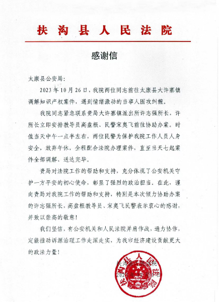 據(jù)了解,10月26日,扶溝法院兩名同志前往太康縣大許寨鎮(zhèn)調(diào)解知識產(chǎn)權(quán)案件,遇到情緒激動的當(dāng)事人圍攻糾纏。兩名法院同志緊急聯(lián)系太康縣公安局大許寨派出所尋求支援,該所許志強(qiáng)所長了解情況后立即安排教導(dǎo)員高盤根、民警宋奧飛前往協(xié)助辦案。時(shí)值當(dāng)天中午一點(diǎn)半左右,兩位民警為保護(hù)法院工作人員人身安全,放棄午休,到事發(fā)地向不明真相的群眾進(jìn)行普法宣講,并對圍堵的當(dāng)事人進(jìn)行批評教育,幫助法院同志解困。事后更是全程配合法院工作人員辦理案件,直至當(dāng)天多起知識產(chǎn)權(quán)案件全部調(diào)解、送達(dá)完畢。