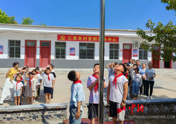 中新河南網(wǎng)9月2日電(李璨)9月1日清晨,常莊鎮(zhèn)三里朱村小學(xué)將開學(xué)第一天的升旗儀式搬進(jìn)村黨群服務(wù)中心,師生與村民代表共同見證這一特殊時刻。在莊嚴(yán)的國歌聲中,五星紅旗冉冉升起,少先隊員們肅立敬禮,稚嫩的臉龐寫滿崇敬。