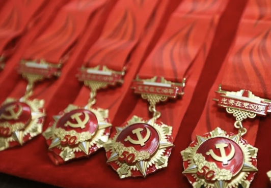 紅色與金色相襯,黨徽與旗幟閃耀。老黨員們戴著沉甸甸的紀(jì)念章,深情凝視著紀(jì)念章,臉上洋溢著自豪和欣慰的笑容……