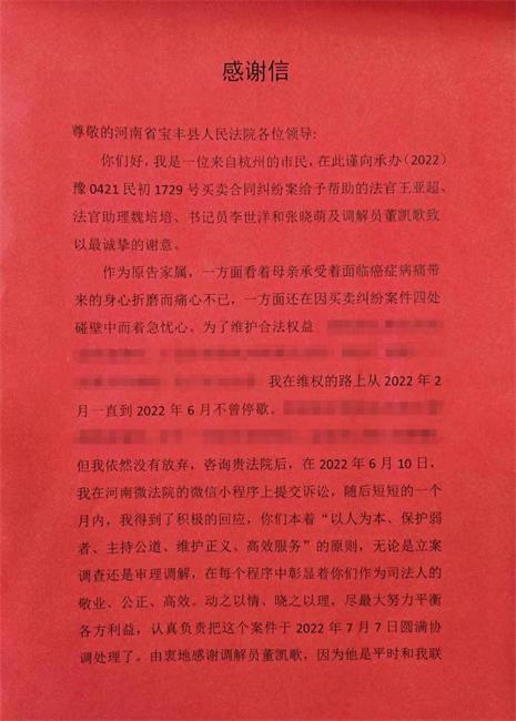 近日,一封來自900公里外杭州市民的感謝信寄到寶豐縣人民法院,向承辦法官王亞超、法官助理魏培培、書記員李世洋和張曉萌及調(diào)解員董凱歌表示誠摯的感謝。