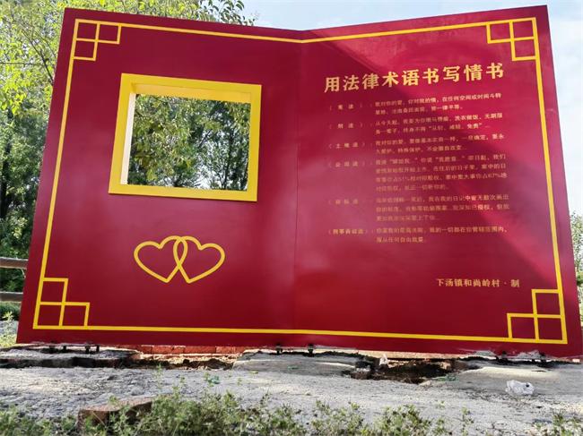 在該村“游玩+普法”法治文化游園里,通過(guò)憲法宣誓誓詞石雕、普法亭、學(xué)法長(zhǎng)廊、法治文化石盤(pán)等,對(duì)現(xiàn)行的憲法、民商法、刑法、行政法、社會(huì)法、經(jīng)濟(jì)法、訴訟與非訴訟程序法等法律知識(shí)進(jìn)行通俗科普;建立“以法律術(shù)語(yǔ)書(shū)寫(xiě)愛(ài)情”為主題的網(wǎng)紅打卡地,也吸引了眾多年輕人的目光。