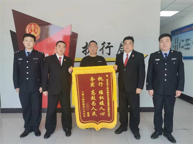 進入執(zhí)行程序后,執(zhí)行干警認真查閱卷宗、梳理案情,第一時間向被執(zhí)行人王某送達執(zhí)行通知書、報告財產(chǎn)令等法律文書,敦促其履行義務、報告財產(chǎn)。與此同時,執(zhí)行干警通過“總對總”線上查控系統(tǒng)對王某名下的財產(chǎn)進行查詢。據(jù)系統(tǒng)反饋,王某名下無任何可供執(zhí)行的財產(chǎn),并且李某也無法提供王某的行蹤及財產(chǎn)線索,案件一度陷入了僵局。“難度再大也要寸步不讓,標的再小也要分毫必爭”。李延彬巧妙地研究對策、制定方案,帶領(lǐng)團隊干警不厭其煩地于不同時段多次奔赴被執(zhí)行人王某可能去的落腳點實地調(diào)查。功夫不負有心人,在一次執(zhí)行行動中,終于查找到王某的下落,面對如同神兵天降的執(zhí)行干警,滿臉錯愕的王某終于明白如何處心積慮地東躲西藏也最終難逃正義的天羅地網(wǎng)。王某隨即被依法拘傳至寶豐法院,在執(zhí)行干警耐心地釋法明理及強大的執(zhí)行震懾下,王某當場將數(shù)萬元案款全部履行完畢。收到案款后,申請人李某難掩激動之情,“我本來對這筆錢都不報啥希望了,沒想到為我這點兒錢,讓咱寶豐法院執(zhí)行局的同志們跑了這么多趟,費了這么多心,你們真是咱老百姓的貼心人、守護神”。第二天清晨,申請人李某早早地來到寶豐法院送錦旗,便有了開頭的一幕。