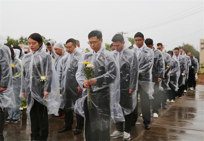 上午9時30分,迎著綿綿細雨,公祭儀式在莊嚴的《義勇軍進行曲》中拉開序幕。面對烈士紀念碑,干警們?nèi)w肅立,懷著沉重的心情向革命烈士們默哀。伴隨著深情的《獻花曲》,10名禮兵抬起花籃,正步向前,將花籃擺放在烈士紀念碑前。最后,干警們緩步繞行瞻仰烈士紀念碑、烈士英名錄,有序敬獻鮮花,寄托對人民英雄的緬懷之情。
