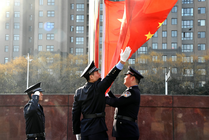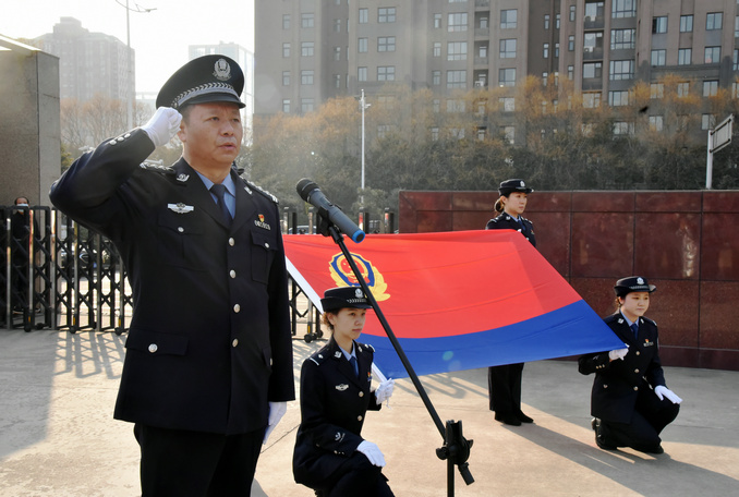 伴隨著雄壯激昂的國(guó)歌聲,鮮艷的五星紅旗冉冉升起,全體民警警容嚴(yán)整、肅然而立,向國(guó)旗敬禮。