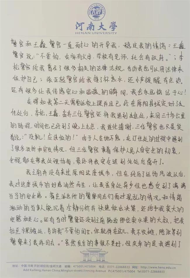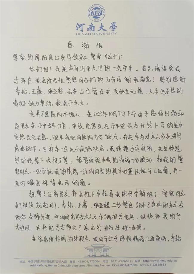 中新河南網(吳淑冉)近日,原陽縣公安局收到一封來自河南大學一名學生的信件,內含一封手寫感謝信,字里行間的紙短情長、情真意切,這些包含深情的贊許和鼓勵既是對原陽警方辛勤付出的高度認可,也是激勵民輔警再接再厲的強大動力。