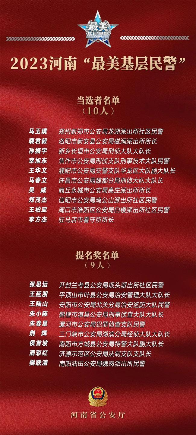 馬玉璞、裴君毅、孫振宇、宰旭東、王華文、馬春立、吳威、鄭茂杰、王柏亞、李方杰等10名同志當(dāng)選2023河南“最美基層民警”。張思遠(yuǎn)、王延朋、王陸山、朱小陳、朱春星、荊輝、侯首坡、酒彩紅、樊聯(lián)清等9名同志榮獲2023河南“最美基層民警”提名獎(jiǎng)。這些先進(jìn)典型全部來(lái)自全省基層一線公安機(jī)關(guān),經(jīng)過(guò)逐級(jí)推薦、廣泛宣傳、媒體推樹(shù)等多個(gè)階段脫穎而出,他們中,有的長(zhǎng)期扎根基層,穿梭社區(qū)村鎮(zhèn),聚力解決群眾“急難愁盼”,成為百姓的貼心人;有的奮戰(zhàn)在打擊一線,沖鋒在前、不怕?tīng)奚,屢破大案要案,成為平安的守護(hù)人;有的立足公安監(jiān)所,關(guān)懷改造監(jiān)管人員,成為高墻里的點(diǎn)燈人。他們雖來(lái)自不同警種,但都以滿(mǎn)腔熱血和無(wú)悔忠誠(chéng)踐行“四句話、十六字”總要求,以最廣大人民的利益為根本坐標(biāo),詮釋著對(duì)黨、對(duì)國(guó)家、對(duì)法律、對(duì)人民的無(wú)限忠誠(chéng),譜寫(xiě)了一曲曲新時(shí)代人民公安為人民的英雄贊歌,充分展現(xiàn)了新時(shí)代河南公安克己奉公、無(wú)私奉獻(xiàn)的良好形象。