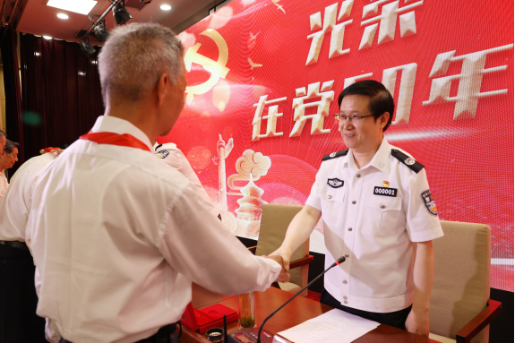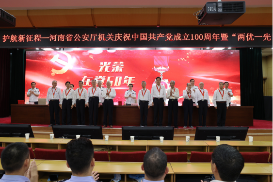 會(huì)議前,全體民警觀看了《中國(guó)共產(chǎn)黨百年述職報(bào)告》《這百年》兩部視頻,回顧黨的光輝歷程,推動(dòng)黨史學(xué)習(xí)教育扎實(shí)深入開展。上午10∶30分,表彰大會(huì)在雄壯的《中華人民共和國(guó)國(guó)歌》聲中開始。會(huì)議宣讀了中共河南省公安廳委員會(huì)關(guān)于表彰河南省公安廳機(jī)關(guān)優(yōu)秀共產(chǎn)黨員、優(yōu)秀黨務(wù)工作者和先進(jìn)基層黨組織的決定,為受表彰的“兩優(yōu)一先”代表頒發(fā)了獎(jiǎng)杯獎(jiǎng)牌、榮譽(yù)證書,并向特別邀請(qǐng)的11位50年以上黨齡老黨員代表頒授“光榮在黨50年”紀(jì)念勛章。