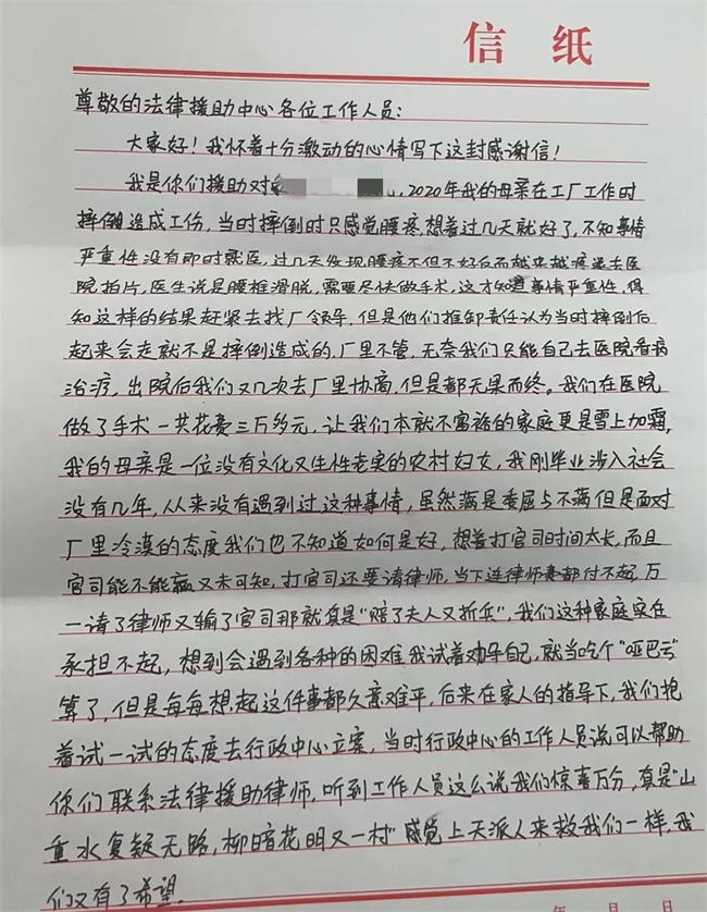 事情還要從前年說起。2020年,王女士在工廠工作時摔倒造成工傷,但廠領導推卸責任,雖經多次協商仍舊無果而終。原本不富裕的家庭變得雪上加霜,無奈之際申請了法律援助。法律援助律師劉鳴友通過確認勞動關系、工傷認定、撰寫起訴狀、出庭審判等,耐心幫助、釋法明理,讓當事人的問題得以圓滿解決。