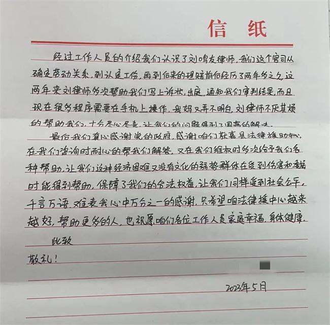 近日,獲嘉縣法律援助中心收到了來自受援人王女士的手寫信,信里字跡工整,字里行間透露著對法律援助律師最真摯的感謝。
