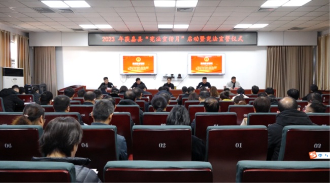縣人大常委會(huì)副主任蔡建勝宣布“2023年獲嘉縣憲法宣傳月”正式啟動(dòng),F(xiàn)場(chǎng)參會(huì)人員全體起立,進(jìn)行集體憲法宣誓。縣委常委宣傳部部長(zhǎng)、副縣長(zhǎng)趙婧領(lǐng)誓。