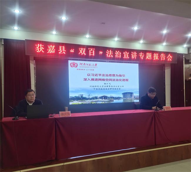 中新河南網(wǎng)(李力 郁成才)12月25日,新鄉(xiāng)獲嘉縣舉辦縣委理論學(xué)習(xí)中心組(擴(kuò)大)集體學(xué)習(xí)暨“雙百”《深入推進(jìn)網(wǎng)絡(luò)空間法治化進(jìn)程》宣講報(bào)告會(huì),特邀河南師范大學(xué)民法學(xué)博士、法理學(xué)博士后郭少飛副教授作專題報(bào)告?h委理論學(xué)習(xí)中心組成員,縣直有關(guān)單位,鄉(xiāng)(鎮(zhèn))主要負(fù)責(zé)同志共300余人參加。獲嘉縣委政法委書記張傳濤主持會(huì)議。