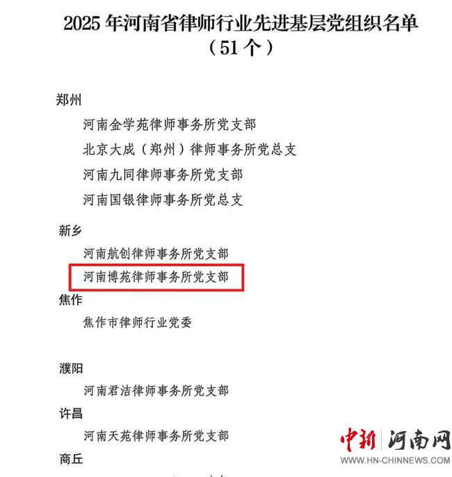 中新河南網(wǎng)(馬昊偉 張珂瑜)日前,在河南省律師行業(yè)委員會(huì)表彰決定中,河南博苑律師事務(wù)所黨支部被授予“全省律師行業(yè)先進(jìn)基層黨組織”榮譽(yù)稱號(hào)。