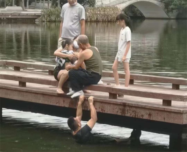 危急時刻,一名中年男子連衣服鞋襪也顧不上脫就沖出人群,躍入湖中,奮力游至小女孩身邊,抓住了小女孩的手;為了避免小女孩嗆水,中年男子右手把她托舉起來,左手劃水游向附近棧橋。由于湖水較深,加上衣服濕透后變得十分沉重,中年男子托著小女孩游至棧橋前時,已經(jīng)筋疲力盡,最后一位老者伸手把小女孩拉上棧橋,又和另外幾人合力幫忙,才將中年男子拖拉到了岸上。