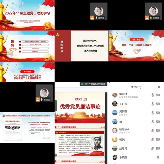 中新河南網(wǎng)11月30日電(趙平安)為深入學(xué)習(xí)貫徹黨的二十大精神,2022年11月29日上午,新華保險(xiǎn)安陽中支黨支部組織召開11月主題黨日學(xué)習(xí)會議,全體黨員同志通過騰訊會議參會。