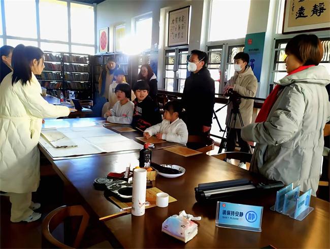 被邀請的書法家,教師、學生家長及小學學生冒著嚴寒從四方八方按時趕赴現(xiàn)場。在甲骨文書屋,由攝制組精心策劃,進行了喜迎冬至的書寫甲骨書法和繪畫梅花交流。年愈77歲的鳥蟲篆非物質(zhì)文化遺產(chǎn)傳承人趙平安,身著太極服裝,揮毫潑墨,書寫了《冬至福至》四個甲骨文書法,教師、學生和學生家長用紅色點染了臘梅圖。拍攝現(xiàn)場充滿了歡聲笑語。