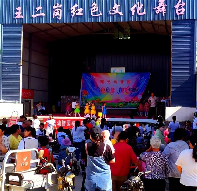 孩子們隨著主持人預(yù)報(bào)的節(jié)目,隨著伴奏的音樂歌曲,翩翩起舞,學(xué)前班、小班、中大班、大班的兒童先后表演了夢想家、好寶寶、快板、大家一起來、小城夏天、青春快出發(fā)、印度女孩、中華美少年等。智能幼師配合表演了螢火蟲對星星說、啦啦操。獲得王二崗村民的陣陣掌聲。