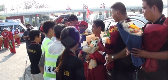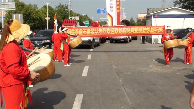 活動(dòng)現(xiàn)場:盤鼓陣陣,獅舞翻騰,一條條寫著歡迎救援英雄凱旋歸來的條幅由歡迎隊(duì)伍沿路邊扯起,原陽縣中醫(yī)院派出的兩輛救護(hù)車及醫(yī)護(hù)人員早早在現(xiàn)場待命,原陽縣公安局交警隊(duì)民警也在現(xiàn)場指揮交通,幫忙維持秩序。多家媒體也派員到了現(xiàn)場。盡管當(dāng)時(shí)天氣炎熱,氣溫接近四十度,但是依然掩蓋不了迎接人員更高的熱情。