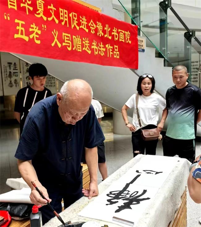 他們每天自帶筆墨、氈布、紙張,從九點一直書寫到11點,一幅幅親手書寫的書法作品贈送到群眾手中,感動著人們,每個同志汗水在臉上流淌,忘記了疲勞,受到廣大民眾的贊揚,充分體現(xiàn)了五老書畫家健康向上,老有所樂、老有所為余熱生輝的奉獻精神。