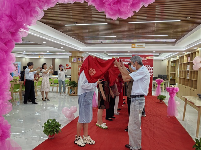 活動中,工作人員設置了攜手走紅毯、揭起紅蓋頭、齊寫心愿墻、作手印相框、抽盲卡等多個環(huán)節(jié),向群眾宣傳移風易俗的重要意義與價值,在一個個互動的環(huán)節(jié)中,不僅增添了儀式感,更讓每對老人在這個特殊的日子里感受到彼此的重要與珍視,為老人帶來了更多的歡樂和難忘的瞬間。
