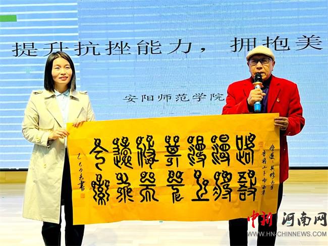 安陽市五老骨干、關(guān)心下一代先進(jìn)工作者、非遺鳥蟲篆傳承人趙力志,為高老師送上自己的書法作品,行書《勇毅前行,碩果飄香》、鳥蟲篆《路漫漫其修遠(yuǎn)兮,吾將上下而求索》古人曲原的詩句。對(duì)高老師進(jìn)校園講課,鼓勵(lì)少年兒童的成長(zhǎng)表示祝賀,也對(duì)龍文學(xué)校師生的在校園里奮發(fā)向上寄于希望。學(xué)生代表史雨欣為高老師送上了鮮花,代表師生表示感謝。