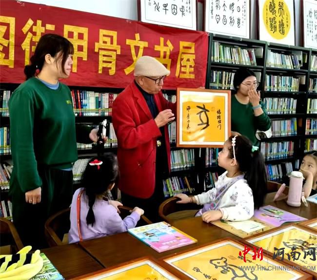 他們還請80歲的趙平安爺爺,給兒童和教師介紹了書屋概況,講解了甲骨文發(fā)源地安陽的寶貴歷史價值。用十二生肖節(jié)骨文字,讓孩子們近距離面對面的認(rèn)識、了解甲骨文,教育培養(yǎng)兒童人人熱愛甲骨文字,人人要寫好甲骨文字,人人在熱愛甲骨文字中更加熱愛故鄉(xiāng)安陽的幼小心靈。