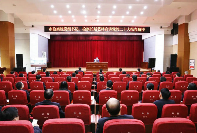 許昌市檢察院黨組書記、檢察長趙藝林為全市檢察干警作專題宣講輔導,強調要把學習宣傳貫徹黨的二十大精神,作為當前和今后一個時期的首要政治任務,緊緊圍繞習近平總書記“五個牢牢把握”的重要論述和重要指示,深入貫徹落實中央、省委、市委和最高檢、省檢察院安排部署,認真做好“堅定信仰、理論武裝、把握精髓、轉化落實”大文章,奮進新征程,走好趕考路,努力以出彩檢察業(yè)績答好新的時代答卷。