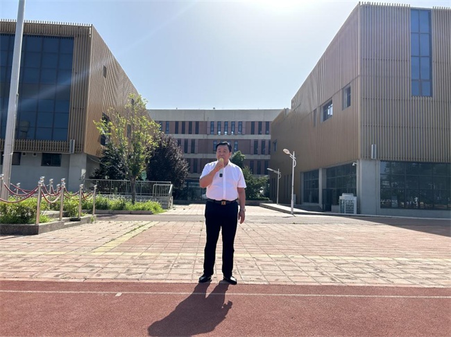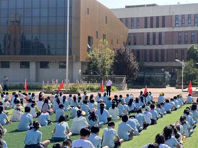 早上八點(diǎn)三十,晴空萬里,驕陽似火。張書占律師站在五星紅旗下,開展暑期安全普法教育。