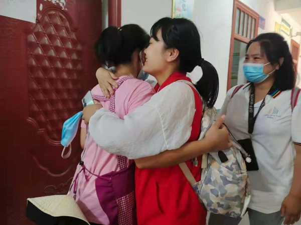 這個(gè)安置點(diǎn)的一樓都是高齡老人和殘疾人,每個(gè)房門上都細(xì)心的貼上房間人員名單,標(biāo)注了姓名和年齡。我們在探訪一樓老人時(shí),有一位女性工作人員,穿著樸素,帶著圍裙,在向我介紹這里的情況,剛開始以為是做飯的大姐,但是她能詳細(xì)說出每個(gè)房間里老人的情況,包括老人的喜好和家人數(shù)量。與她交談才知道,她是學(xué)校的一名任課老師,自愿來做志愿者,負(fù)責(zé)照顧老人的飲食起居,她會(huì)把飯菜親自送到每個(gè)高齡老人的房間,還為生活不能自理的老人準(zhǔn)備成人紙尿褲。洪災(zāi)轉(zhuǎn)移的當(dāng)天晚上,她看見有個(gè)老人下身沒穿褲子,就自己花錢為她買了好幾套衣服,和她一起做這些志愿服務(wù)的還有學(xué)校的很多老師。我稱贊他們的貼心和善良,她說,這不算什么,這些老人的兒女留在村里防汛,他們更辛苦。我說,你們?nèi)绱司恼疹欉@些老人們,他們的兒女才能安心的在前線工作,你們同樣偉大。也許是這些話觸動(dòng)了她,她又告訴社工,其實(shí)他們已經(jīng)連續(xù)三四天沒有好好吃飯和睡覺了,她也好久沒看到家里三歲的孩子了,孩子最近一直念叨媽媽,話沒說完她眼睛已經(jīng)濕潤。我太理解她了,因?yàn)槲乙彩莻(gè)母親,家里有還未斷奶的孩子。。。我強(qiáng)忍著自己的眼淚,安慰的話梗在喉嚨,幸好平平反應(yīng)快,直接上前擁抱了她。我快速平復(fù)心情,什么也不用說了,同為母親,一樣的心情,上前再次給了她一個(gè)大大的擁抱。這個(gè)擁抱,給他們,也同樣給自己。