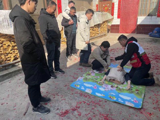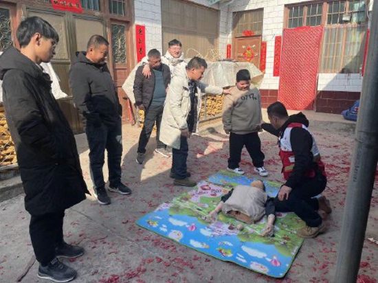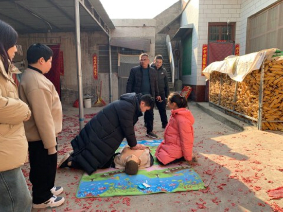 大年初一,處處洋溢著節(jié)日的氣氛,親友們相互問候,表達著新年的祝福。志愿者荊軍體號召家人一起把“急救地攤”擺到家鄉(xiāng),向親朋好友面對面手把手教授心肺復(fù)蘇、海姆立克急救法等急救知識和技能,以這種特殊的新年禮物奉獻給家鄉(xiāng)父老。
