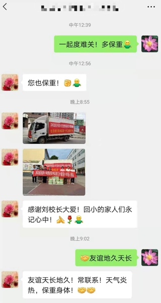 學(xué)校后勤安保主任時永軍、趙江偉將援助物資交給萬艷娜老師