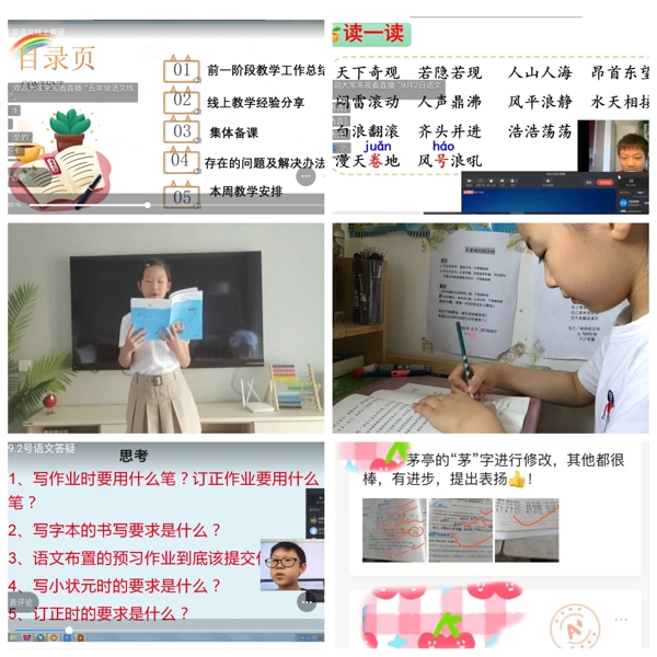 語文組共享教學資源,認真研讀教材、集體在線研討、精心制作課件。晨曦誦讀,與黎明共舞,領略母語的魅力,積累優(yōu)美語言文字;陽光午讀,師生共讀經(jīng)典,豐富精神內(nèi)涵;線上課程、答疑互動,打造高效出彩課堂,讓孩子們樂學善思,學有所獲,出彩成長每一天。