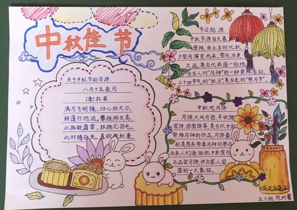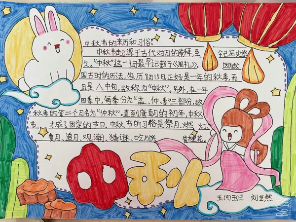 活動前,各年級結(jié)合少先隊員的年齡特點,創(chuàng)設(shè)了內(nèi)容豐富的“中秋”主題活動版面,營造濃厚的節(jié)日氛圍;顒又校爢T們通過圖片、視頻等形式在云端分享自己的作品。在五六中隊云端直播活動中,少先隊員翟歆瑤首先通過視頻為大家介紹了中秋節(jié)的來歷和習(xí)俗,使隊員們對中秋傳統(tǒng)節(jié)日有了更詳細的了解。接著,王藝琳為大家?guī)砹烁枨对聺M中秋》,讓孩子們在音樂中感受中秋節(jié)的文化內(nèi)涵。之后,張琪涵為大家展示了美輪美奐的舞蹈,視頻中的她舞姿靈動飄逸,贏得隊員們的嘖嘖稱贊。其他隊員通過中秋征文、詩歌朗誦、手抄報等形式喜迎中秋。