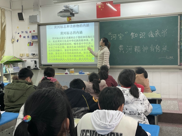 在活動(dòng)中,輔導(dǎo)員老師們先帶領(lǐng)隊(duì)員們了解了黃河標(biāo)志和吉祥物產(chǎn)生的背景,通過老師的講解,隊(duì)員們知道了黃河的標(biāo)志,還認(rèn)識(shí)了吉祥物“黃小軒”“河小洛”“寧小陶”“天小龍”“夏小鯉”“平小牛”,并深入了解了黃河的標(biāo)志和內(nèi)涵。“黃河是中華民族的重要象征,是中華民族精神的重要標(biāo)志。‘河寶’融合了黃帝文化、河洛文化、仰韶文化、中華龍文化、鯉魚吉祥文化以及鎮(zhèn)河鐵牛和‘三牛精神’,囊括黃河流域最具代表性的文化遺產(chǎn)、自然生態(tài)和精神標(biāo)識(shí)。”在五(1)中隊(duì)教室,輔導(dǎo)員張荷老師向隊(duì)員們講道。